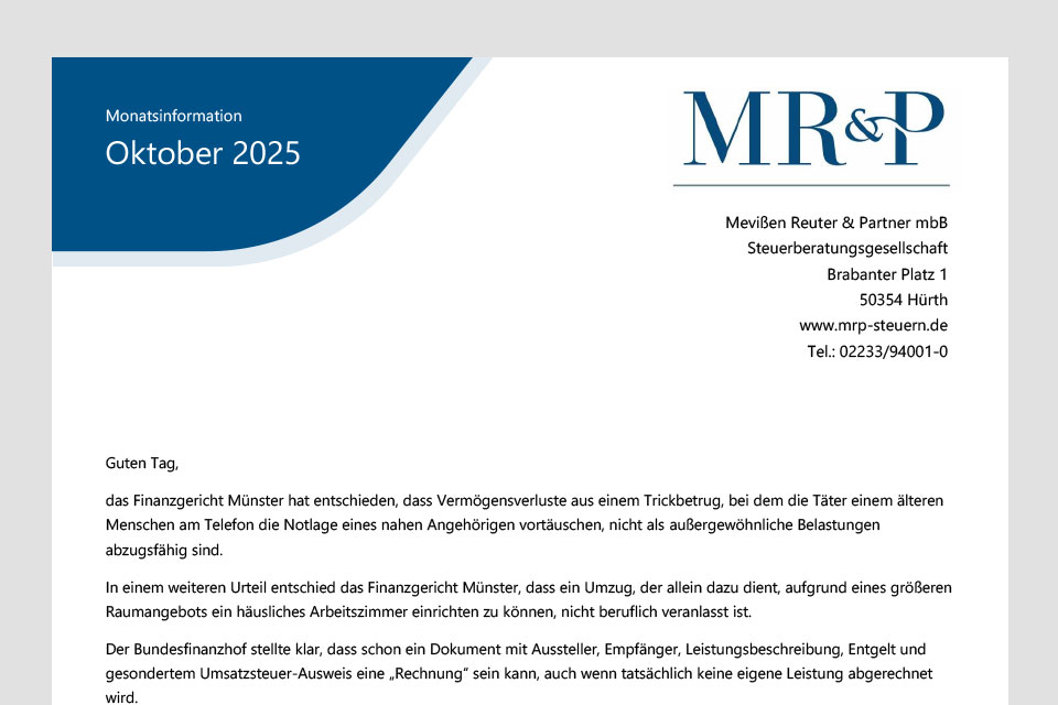 Das Finanzgericht Münster hat entschieden, dass Vermögensverluste aus einem Trickbetrug, bei dem die Täter einem älteren Menschen am Telefon die Notlage eines nahen Angehörigen vortäuschen, nicht als außergewöhnliche Belastungen abzugsfähig sind.